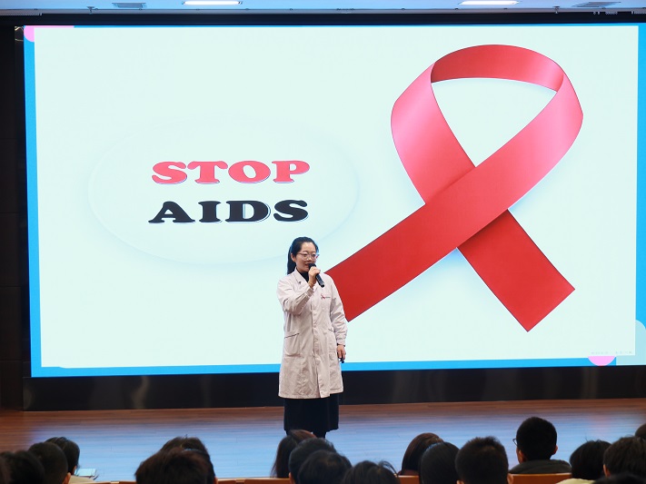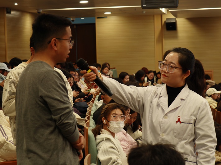 讲座特邀长期深耕艾滋病诊疗一线的陈玉梅医生担任主讲。她以一组触目惊心的防艾数据开篇,直言“艾滋病离大公司园并不遥远,但完全可防可控”,瞬间引发全场关注。两个多小时的分享中,陈玉梅医生将晦涩的医学知识转化为生动表达:用形象比喻拆解艾滋病发病机理,以动画演示还原病毒攻击免疫系统的过程,结合深夜买醉等贴近校园生活的感染案例,让同学们清晰掌握高危行为的风险;她分享的青少年感染者真实经历,更让在场学子深刻体会到“无知”的代价与“歧视”的伤害。“我们防范的是病毒,而不是感染者。一个拥抱、一次共餐、一句鼓励,都能成为他们前行的光。”陈玉梅医生的话语,既传递了科学认知,更饱含人文关怀。