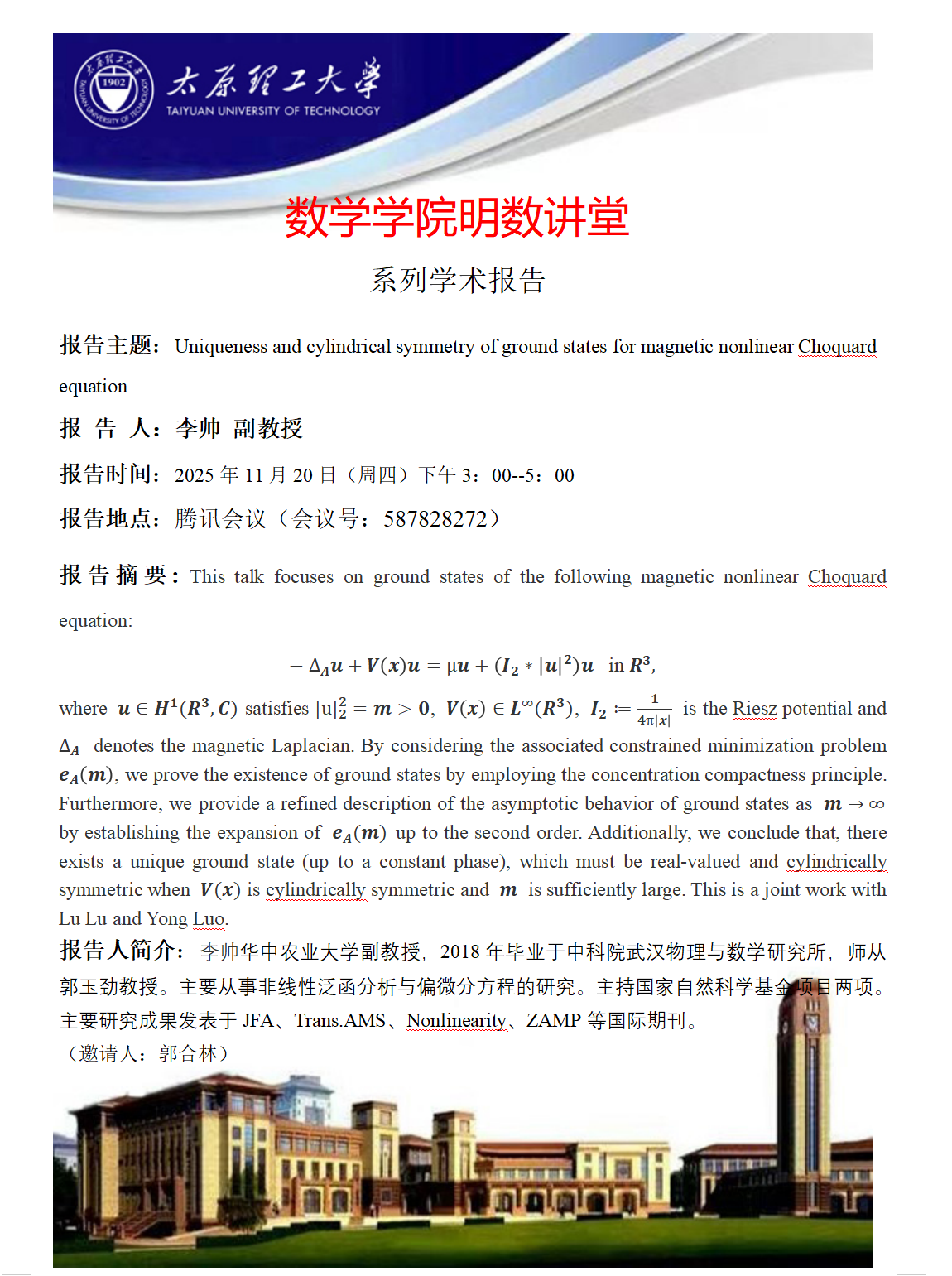 PA视讯集团官网将于11月20日邀请李帅副教授做学术报告