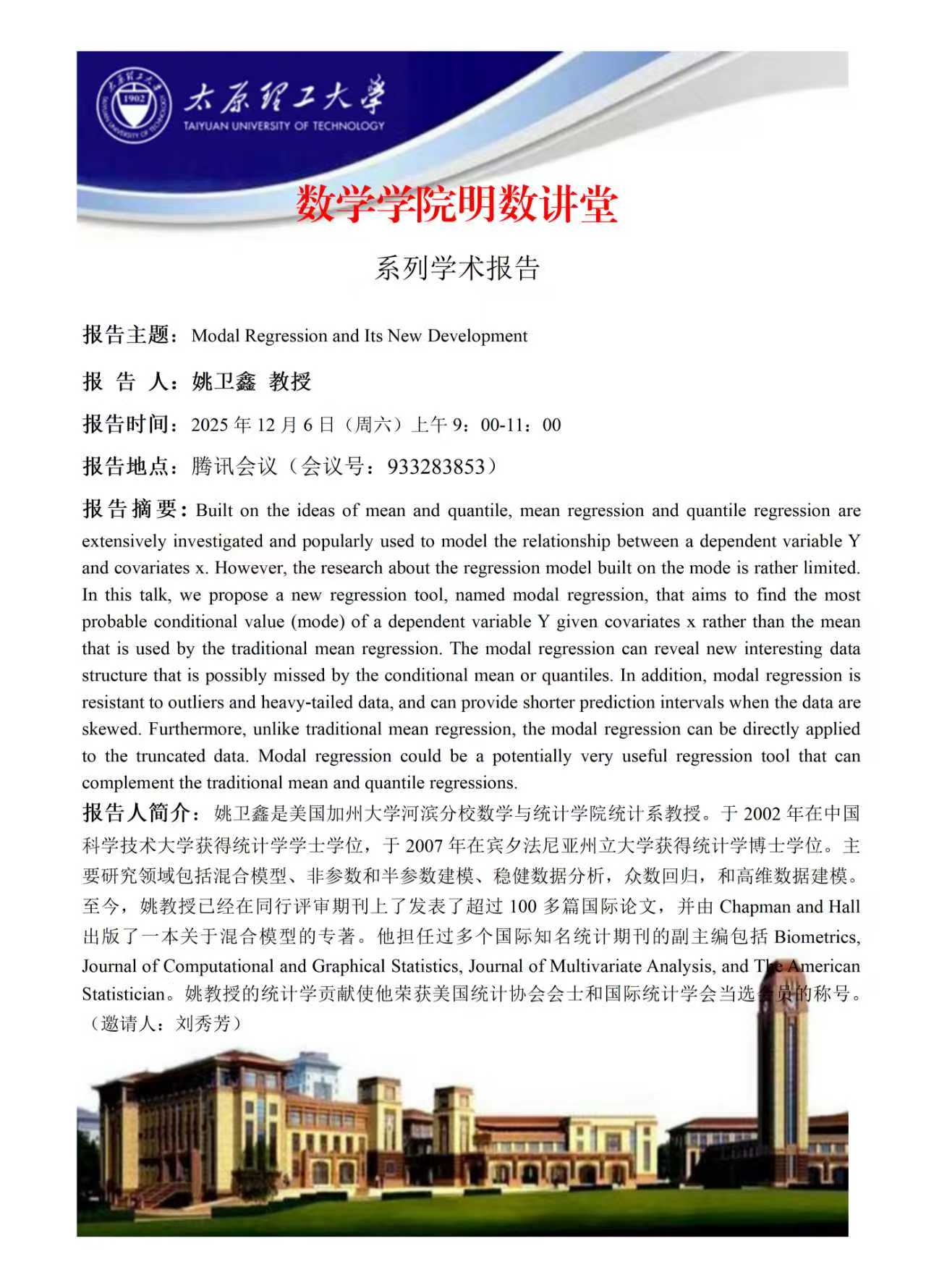 PA视讯集团官网将于12月6日邀请姚卫鑫教授做学术报告
